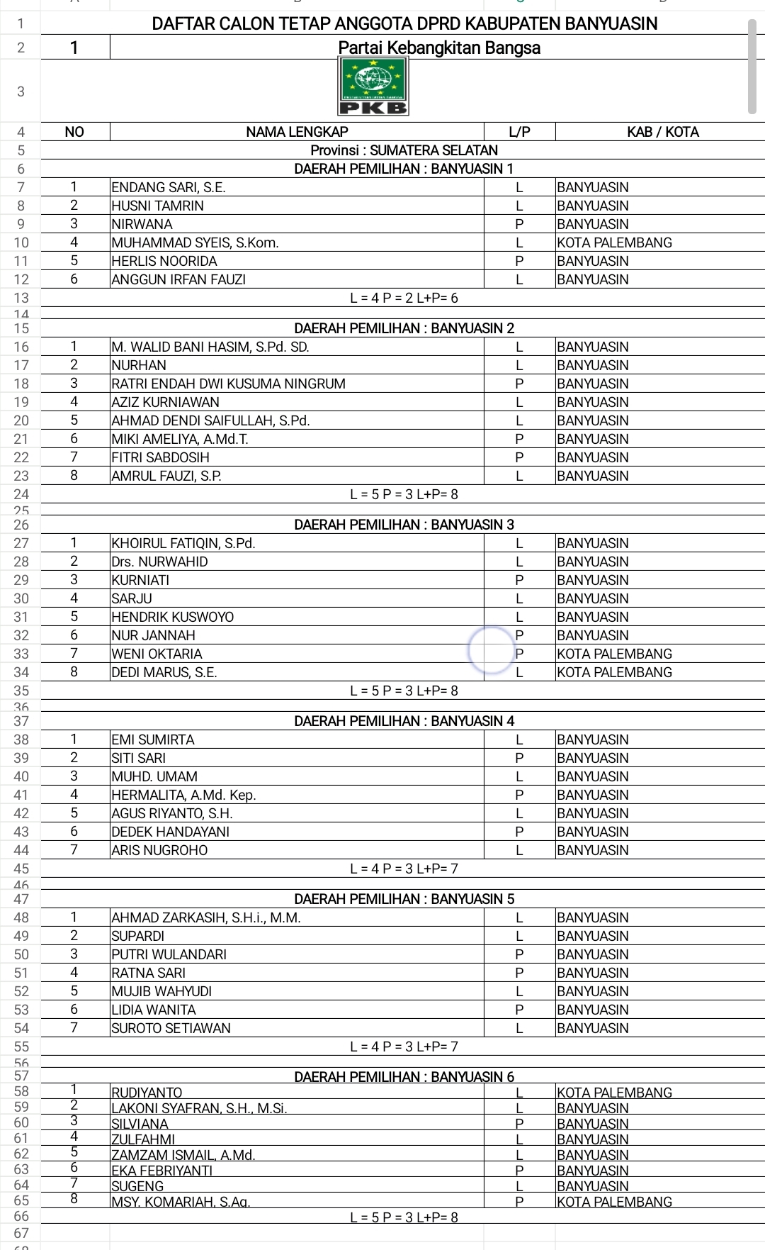 Daftar Calon Tetap (DCT) Anggota DPRD Banyuasin PKB
