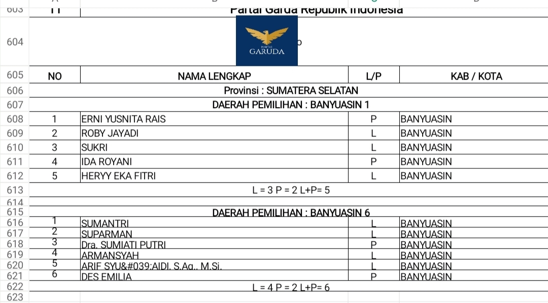 DCT Anggota DPRD Banyuasin Partai Garuda & PAN