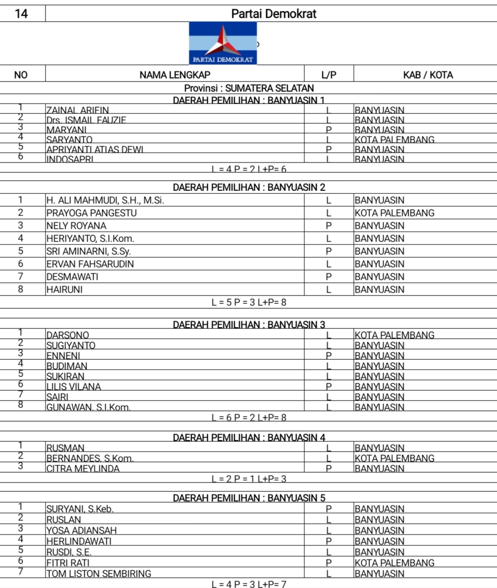 DCT Anggota DPRD Banyuasin Partai PBB & Demokrat