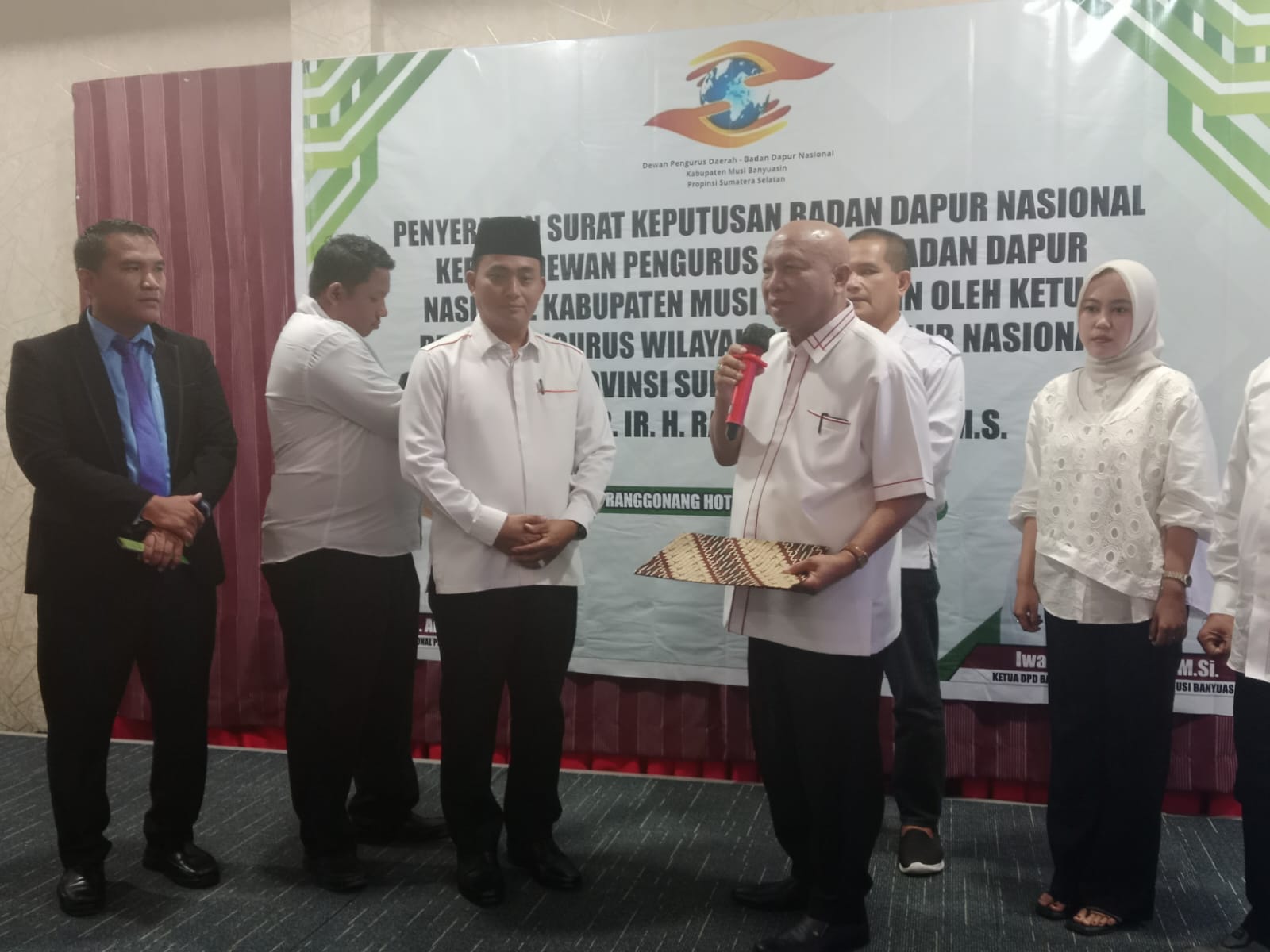 Dalam sambutannya Iwan Aldes S. Sos.M.Si selaku Ketua Dewan Pengurus wilayah Badan Dapur Nasional Musi Banyuasin mengatakan, terimakasih kepada ketua H. Rahidin Anang dan jajarannya yang telah mempercayai kami untuk memberikan tugas atau mandat yang sangat berat ini kedepan kami akan meminta arahan dan komitmen untuk searah dengan Dewan pengurus wilayah Badan Dapur Nasional provinsi Sumatera Selatan , hari ini merupakan momen bersejarah bagi kami penyerahan SK ini bukan sekedar sahnya organisasi secara administrasi melainkan sebuah mandat perjuangan. Urainya